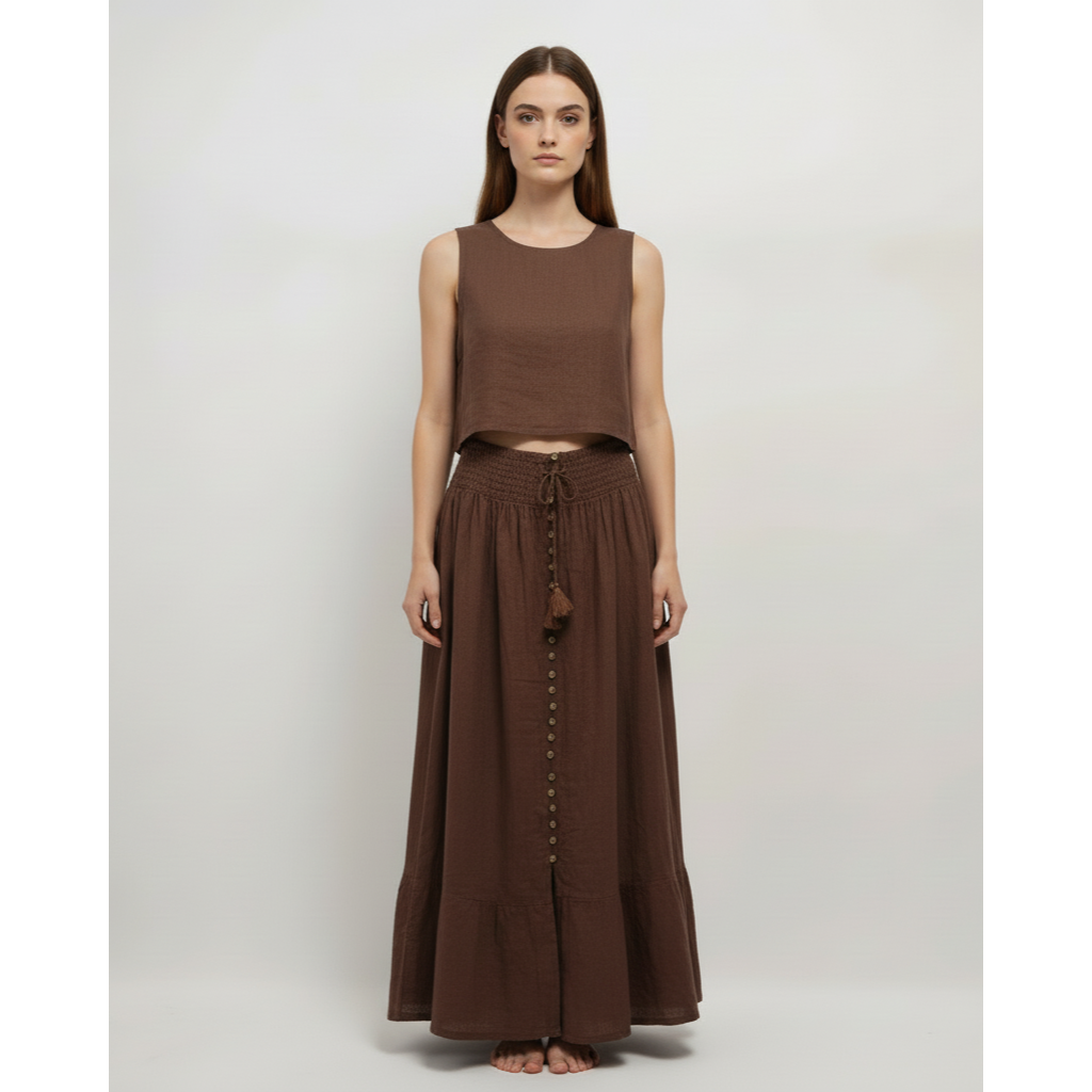 Linen Cropped Top and Maxi Skirt in Chocolate Brown