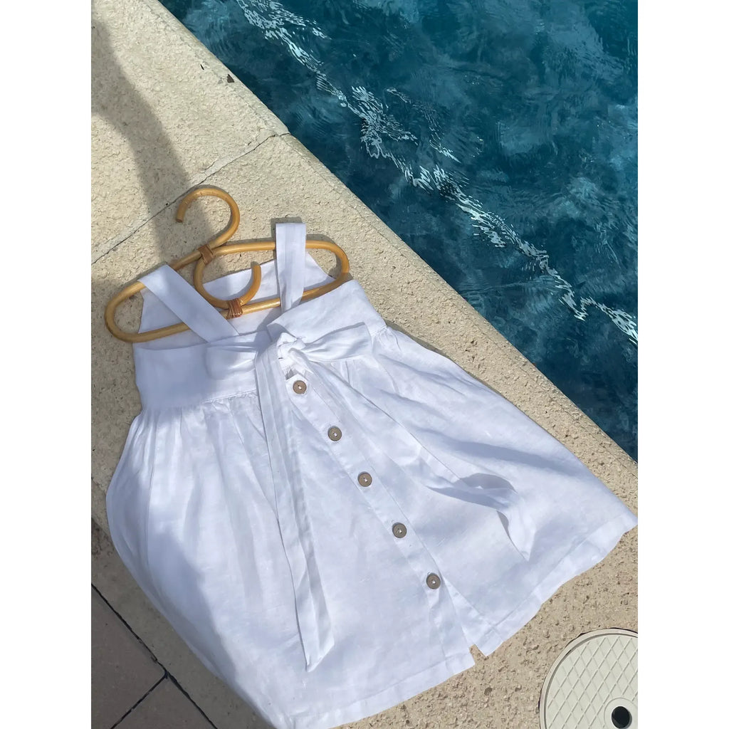 This perfect summer dress is crafted from premium soft European linen, featuring adjustable bow-tie detailing at the back, elegant buttons, and two small front pockets.